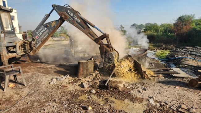 लोणीकाळभोर पोलीस स्टेशनचे कार्यक्षेत्रात सोरतापवाडी, शिंदवणे, लोणीकाळभोर मांडाळमळा येथील अवैध गावठी हातभट्टी दारु भट्टीवर धडक कारवाई करुन काळेशिवार कॅनल जवळ, शिंदावणे येथील गावठी हातभट्टीवर कारवाई केली तेथे जमिनित खड्डे करून अंदाजे चार हजार लिटर गावठी हातभट्टी तयार करण्याचे पक्के रसायन तसेच दारू तयार करण्यासाठी वापरण्यात येणारे चार पत्र्याचे भांडे असे अंदाज ४४०००/- रू किंमतीचा मुद्देमाल पोलीसांनी जेसीबी मशिनचे सहाय्याने नष्ट केला.