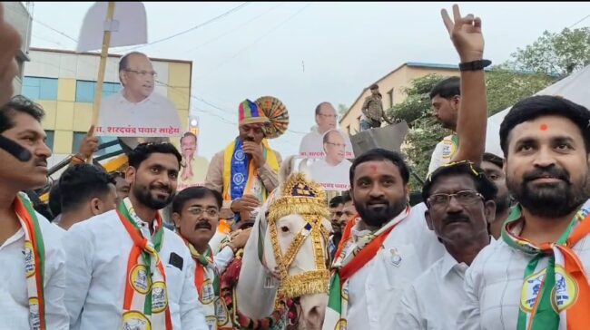 लोणी काळभोर:- ( हवेलीनामा वृत्तसेवा) राष्ट्रवादी काँग्रेस पार्टी शरद पवार गटाचे उमेदवार अशोक पवार यांचे लोणी काळभोर तसेच पूर्व हवेलीत जल्लोषात स्वागत लोणीत घोड्यावर बसून मिरवणूक काढली तर काही ठिकाणी बैलगाडीत मिरवणूक काढण्यात आली यावेळी कार्यकर्ते तसेच ज्येष्ठ नागरिक व युवकांची संख्या मोठ्या प्रमाणावर होती महिला भगिनींनी ही मोठी गर्दी केलेली होती. यावेळी उत्साही कार्यकर्त्यांनी अशोक पवार यांना खांद्यावर घेऊन गावाच्या गावातून मिरवणूक काढली. खोकलाई चौकातून प्रचार रॅलीला सुरुवात झाली. जेसीबी मधून फुलांची उधळण करून, घोड्यावरती बसून अशोक पवार यांची संपूर्ण गावांमध्ये रॅली काढण्यात आली. नागरिकांचा प्रतिसाद पाहिला मिळाला. महिला वर्गांची उपस्थिती मोठ्या संख्येने होती. छत्रपती शिवाजी महाराजांच्या पुतळ्याला पुष्पहार अर्पण करून ग्रामदैवत अंबरनाथच्या मंदिरापुढे कोपरा सभा घेतली .