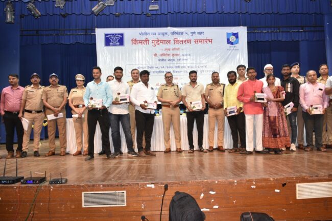 पुणे (हवेलीनामा वृत्तसमुह) पुणे शहर पोलीस आयुक्तालयातील परिमंडळ ५ कार्यक्षेत्रामधील ९ पोलीस ठाणे यांच्याकडे वेगवेगळ्या कलमांना अंतर्गत दाखल असलेल्या गुन्ह्यांमधील ९४ तक्रारदार यांचा रु. १,८०,५७,३२९/- (अक्षरी रुपये एक कोटी ऐंशी लाख सतावन्न हजार तिनशे एकोणतीस फक्त) इतक्या किंमतीच्या दुचाकी, तिनचाकी, चारचाकी वाहने, मोबाईल फोन, सोन्या चांदीचे दागिणे व रोख रक्कम जमा असलेला मुद्देमाल न्यायालयाच्या आदेशानुसार तसेच भारतीय नागरिक सुरक्षा संहिता सन २०२३ चे कलम १०६ मधील तरतुदीनुसार हा किंमती मुद्देमाल संबंधित व्यक्तींच्या ताब्यात देण्यात आला.