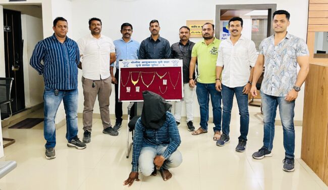 युनिट ६ चे पथक वाघोली पोलिस ठाणे हद्दीत गुन्हे प्रतिबंधक गस्तीवर असताना पोलीस अंमलदार नितीन मुंढे यांना घरफोडीचे गुन्हे करणारा सराईत गुन्हेगार डी. मार्ट जवळ, लोहगाव वाघोली रोड येथे उभा असल्याचे समजले.तेथे पथकासह जाऊन राहुल दगडू शिंदे, वय ३२ वर्षे, रा. पिंरगुट, पुणे संशयितरीत्या मोटार सायकलवर उभा असताना त्यास ताब्यात घेतले. मोटारसायकल बद्दल चौकशीत तो उडवाउडवीची व असमाधानकारक उत्तरे देऊन लागला. त्याची अंगझडती घेतली असता त्याच्याकडे वेगवेगळ्या वर्णनाचे एकूण ८७ ग्रॅम सोन्याचे दागिने, रु. ०६,४०,३२२/-किमतीचे दागीने मिळून आले. तसेच त्याच्याकडील मोटारसायकल बाबत चौकशी केली असता ती देखील चोरीची असल्याचे निष्पन्न झाले.