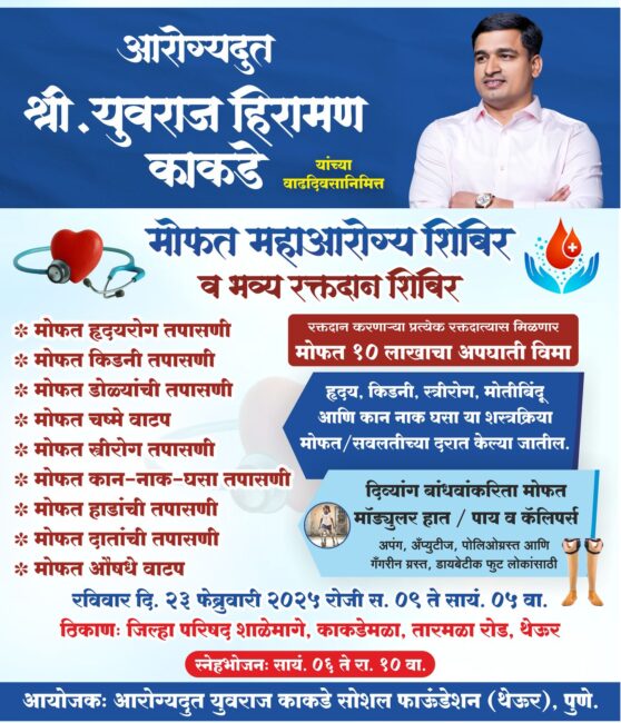 थेऊर (हवेलीनामा वृतसमूह ) माजी मुख्यमंत्री एकनाथ शिंदे यांच्या संकल्पनेतून तयार करण्यात आलेल्या मुख्यमंत्री वैद्यकीय सहायता कक्ष या माध्यमातून या कक्षाचे अध्यक्ष मंगेश चिवटे यांच्या माध्यमातून महाराष्ट्रातील अनेक रुग्णांना जीवनदान मिळाले तसेच वेळेवर आर्थिक मदत मिळाल्याने आरोग्य अबाधित राहिले थेऊर येथील आरोग्यदूत म्हणून परिचित असणारे ग्रामपंचायत सदस्य युवराज काकडे यांनी या माध्यमातून हवेली तालुक्यातील नव्हे तर जिल्यातील अनेक रुग्णांना वेळेवर मदत मिळवून दिल्याने त्यांना नवजीवन मिळाले. याच आरोग्यदुताच्या वाढदिवसाचे औचित्य साधून उद्या रविवारी महाआरोग्य शिबिराचे आयोजन करण्यात आले आहे तसेच रक्तदान शिबिर आणि थेऊर येथे मंजूर झालेल्या कोट्यावधी रुपयांच्या विकास कामांचा शुभारंभ आमदार ज्ञानेश्वर उर्फ माऊली कटके यांच्या हस्ते होणार आहे.या कार्यक्रमाचे आयोजन काकडेमळा प्राथमिक शाळेशेजारी करण्यात आले आहे.