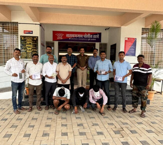 पोलिसांनी दिलेल्या माहितीनुसार पुणे ग्रामीण पोलिसांच्या स्थानिक गुन्हे शाखा व दहशतवाद विरोधी शाखेचे पथक संयुक्तरित्या अवैध गावठी पिस्तुल तस्करी करणाऱ्या, बाळगणारे, खरेदी विक्री करणारे गुन्हेगारांवर कारवाई करण्यासाठी नारायणगाव पोलीस स्टेशन हद्दीत पेट्रोलिंग करत असताना, दहशतवाद विरोधी पथकातील पोलिस शिपाई ओंकार शिंदे, मोसीन शेख यांना बातमीदाराकडून बातमी मिळाली की नारायणगाव एस.टी.स्टँड परिसरात एका स्प्लेंडर मोटार सायकलवर तीन इसम संशयित रित्या फिरत असून त्यांच्या जवळ गावठी पिस्तुल आहेत अशी माहिती मिळताच तपास पथकाने मिळालेल्या बातमीच्या अनुषंगाने नारायणगाव एस.टी. स्टैंड परिसरातून धनंजय चक्रधर साळुंखे( वय २० वर्षे, रा. कारेगाव ता शिरूर) सुरज आप्पासाहेब कर्डीले (वय १८ वर्षे, रा. रामलिंग शिरूर ता शिरूर) अनमोल दादाभाऊ जाधव, (वय २७ वर्षे, रा. कारेगाव ता शिरूर ) या तिघांना ताब्यात घेतला असता त्यांचयाकडे अवैध रित्या बाळगलेली एकूण तीन गावठी पिस्तुल, नऊ जिवंत काडतूस व मोटार सायकल असा एकूण १,७५,०००/- रूपये किंमतीचा मुद्देमाल मिळून आला आहे.यातील आरोपीं धनंजय साळुंखे याचेवर यापूर्वी शरीराविरूद्धचा दुखापतीचा एक गुन्हा दाखल आहे.