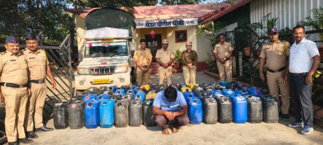 पोलिसांनी दिलेल्या माहितीनुसार, थेऊर ते कोलवडी रस्त्यावर थेऊरगावच्या हद्दीतील स्मशानभूमी जवळ गावठी दारूची वाहतूक करणारी गाडी जाणार असल्याची माहिती गुप्त बातमीदारकडून थेऊर पोलीस चौकीचे पोलीस उपनिरीक्षक रत्नदीप बिराजदार व दिगंबर सोनटक्के यांना मिळाली असता त्यांनी मिळालेल्या माहितीनुसार मुळा मुठा नदी जवळ सापळा रचला यावेळी बातमी मिळालेल्या वर्णनाची पिकअप गाडी दिसली गाडीची तपासणी केली असता गाडीमध्ये कॅन आढळून आले त्यावर भुशाची पोती ठेवली होती त्याखाली दारुची कॅन होते पोलीसही या वाहतुकीच्या पद्धतीमुळे चक्रावून गेले यामध्ये अवैधरित्या दारुची वाहतूक करणाऱ्या सोमनाथ सुरेश राखपसरे ( वय २९रा.दहिटणे ता.दौड) याला ताब्यात घेतले.
