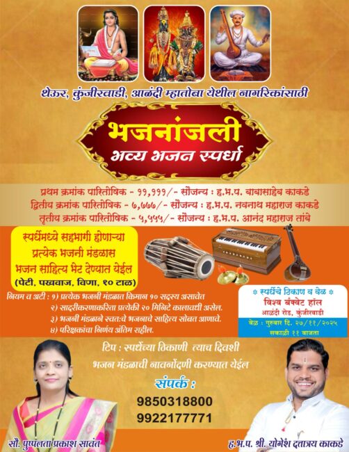 थेऊर (हवेलीनामा वृतसमूह) स्थानिक स्वराज्य संस्था निवडणुकीच्या पार्श्वभूमीवर थेऊर पंचायत समिती गणातील नागरिकांसाठी”भजनांजली” ही भव्य भजन स्पर्धा पुष्पलता प्रकाश सावंत आणि योगेश दत्तात्रय काकडे यांच्या माध्यमातून थेऊर कुंजीरवाडी आणि आळंदी म्हातोबा या गावासाठी आयोजित केली आहे.ही स्पर्धा विश्व बँक्वेट हॉल आळंदी रोड, कुंजीरवाडी येथे गुरुवार दि. २७/११/२०२५ सकाळी ११ वाजता होईल.