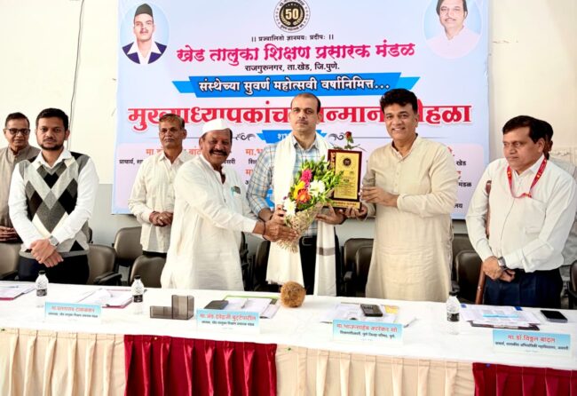 ते हुतात्मा राजगुरू महाविद्यालयात संस्थेच्या सुवर्ण महोत्सवानिमित्त आयोजित मुख्याध्यापक सन्मान सोहळा व सहविचार सभेत बोलत होते. या प्रसंगी गटशिक्षणाधिकारी अमोल जंगले, संस्थाध्यक्ष ॲड.देवेंद्र बुट्टे पाटील, उपाध्यक्ष नानासाहेब टाकळकर, संचालक बाळासाहेब सांडभोर, सुरेश टाकळकर, अवसरी अभियांत्रिकी महाविद्यालयाचे प्राचार्य डॉ. विठ्ठल बांदल, मुख्याध्यापक संघाचे अध्यक्ष संजय बोरकर, प्राचार्य डॉ. शिरीष पिंगळे, डॉ. एच.एम.जरे, उपप्राचार्य प्रा. विठ्ठल दौंडकर, प्रा.एस.टी.फुंदे उपस्थित होते. या कार्यक्रमात संस्थेच्या वतीने तालुक्यातील सर्व मुख्याध्यापकांचा सन्मानचिन्ह देऊन सत्कार करण्यात आला.