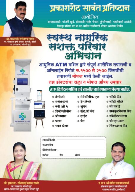 या अभियानाचा प्रारंभ दि.१९ डिसेंबर रोजी थेऊर येथे होणार असून दोन दिवस हे आरोग्य शिबिर असणार आहे यामध्ये नवीन तंत्रज्ञानाचा वापर करुन आधिनुक एटीएम च्या साहाय्याने संपूर्ण शरीराची तपासणी करण्यात येणार आहे. दोन दिवस या शिबिरात विविध प्रकारच्या तपासण्या करण्यात येणार आहे ही आरोग्य शिबिरे टप्प्याटप्प्याने प्रत्येक गावात होणार आहेत यामध्ये तज्ञ डॉक्टरांच्या पथकामार्फत तपासणी करून मोफत तपासणी तसेच मोफत औषध उपचार करण्यात येणार आहे त्यामुळे जास्तीत जास्त नागरिकांनी या शिबिराचा लाभ घ्यावा असे आवाहन मांजरी गावच्या माजी उपसरपंच सीमाताई प्रकाश सावंत व गुरुदत्त पतसंस्थेचे चेअरमन योगेश काकडे यांनी केले आहे.