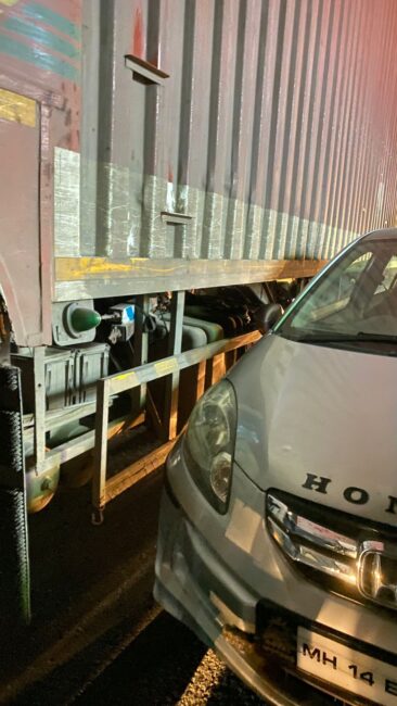 पुणे–सोलापूर महामार्गावरील कासुर्डी फाटा येथे अपघाताची घटना घडली. ओव्हरटेक करत असताना ट्रक चालकाने बाजूने जाणाऱ्या होंडा कारला डॅश दिला, त्यामुळे कारच्या पुढील भागाचे नुकसान झाले आहे.