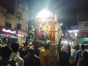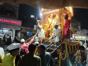 आळंदी ( हवेलीनामा प्रतिनिधी) : श्री नृसिंह सरस्वती स्वामी महाराज यांचे वार्षिक श्रींची रथोत्सव मिरवणूक श्री क्षेत्र आळंदी नगरीतून संपन्न झाली . यावेळी मार्गावर रांगोळ्यांच्या पायघड्या, विद्युत रोषणाईने सजलेला श्रींचा भव्य रथ पुढे फटाक्यांची आतषबाजी करण्यात आली. फुलांची उधळण करीत भाविकांनी दर्शनास गर्दी केली होती. श्रीचा पुण्यतिथी महोत्सव आणि अन्न प्रसादास भाविकांनी गर्दी केली.
