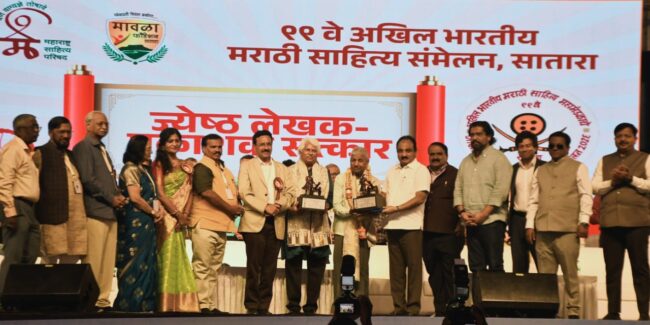 निमित्त होते, ९९व्या अखिल भारतीय मराठी साहित्य संमेलनात आयोजित केलेल्या ज्येष्ठ लेखक-प्रकाशक सत्कार सोहळ्याचे. या सोहळ्यात लक्ष्मण गायकवाड आणि ज्येष्ठ प्रकाशक बाबूराव मैंदर्गीकर यांचा आज (दि. ३) विशेष सन्मान करण्यात आला. या वेळी व्यासपीठावर प्रमुख पाहुणे म्हणून राज्याचे मदत व पुनर्वसन मंत्री मकरंद पाटील, साहित्य संमेलनाचे अध्यक्ष विश्वास पाटील, अखिल भारतीय मराठी साहित्य महामंडळाचे अध्यक्ष प्रा. मिलिंद जोशी, स्वागताध्यक्ष शिवेंद्रराजे भोसले, कार्याध्यक्ष विनोद कुलकर्णी, कार्यवाह सुनिताराजे पवार, अमेरिकेचे खासदार व साहित्यिक श्रीनिवास ठाणेदार आदी मान्यवर उपस्थित होते.