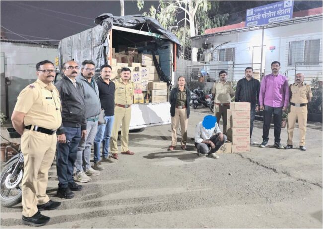 पुणे महानगरपालिका निवडणुक अनुषंगाने वरीष्ठांचे आदेशानुसार तपासपथक पोलीस अधिकारी, पोलीस अंमलदार पोलीस स्टेशनच्या हद्दीत अवैद्य धंद्यावर कारवाई चालू असताना गोष्टीवर असलेल्या पथकास वाघोली ते केसनंद रस्त्यावर एक व्यक्ती पांढरे रंगाचे पिकअप वाहनातुन विनापरवाना विदेशी दारुची वाहतुक करणार असल्याची माहिती मिळाल्याने तेथे सापळा रचून वाघोली कडुन येणारे वाहनाची पाहाणी करीत असतांना दिसले त्यावर चालकास वाहन थांबविण्याचा इशारा केला असता त्याने वाहन रोड कडेला उभे केले, वाहन चालक कपील दिगंबर शाहु वय २६ वर्षे रा लाडबावस्ती, केसनंद ता हवेली जि पुणे मुळगांव मु आंदेगाव पो वळग ता मुखेड जि नांदेड असे असल्याचे सांगीतले. पिकअप नंबर एम एच ३८ एक्स २८२२ मध्ये विनापरवाना विदेशी दारु मिळुन आली