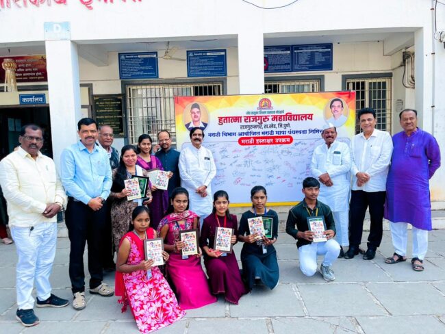 राजगुरूनगर (हवेलीनामा प्रतिनिधी) : येथील हुतात्मा राजगुरू महाविद्यालयातील मराठी विभागाच्या वतीने मराठी भाषा संवर्धन पंधरवड्याचे औचित्य साधून ‘माझी मराठी स्वाक्षरी’ हा अभिनव उपक्रम राबविला.